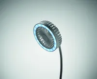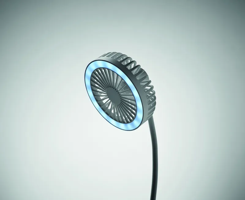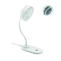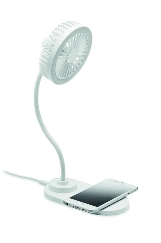 10W-os asztali vezeték nélküli töltő ventilátorral és 80 lumenes LED lámpával, ABS-ből. Ventilátor 3 sebességfokozattal. Teljesítmény: DC 9V/1,1A (10W) a gyorstöltéshez. Qi készülékekhez.