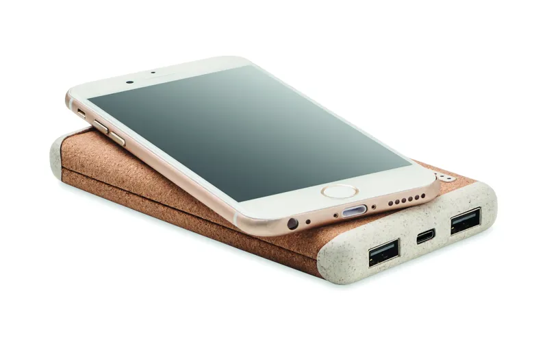10.000 mAh külső akkumulátor, 10 W-os vezeték nélküli töltéssel, parafa házzal, ABS-búzaszalma részletekkel. Támogatja a gyorstöltési technológiát (20 W). C típusú bemenet és kimenet. A parafa 100%-ban természetes anyag. Szerkezeti jellege és felületi porozitása miatt az egyes tárgyak végső emblémázási eredménye eltéréseket mutathat. PD (Power Delivery) támogatással a legújabb laptopok töltéséhez.