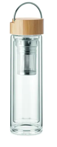 Duplafalú palack boroszilikát üvegből, fém fogantyús bambusz kupakkal, teaszűrővel. Űrtartalom: 400 ml. A bambusz természetes anyag, színében, mintázatában és méretében esetenként eltérő lehet.