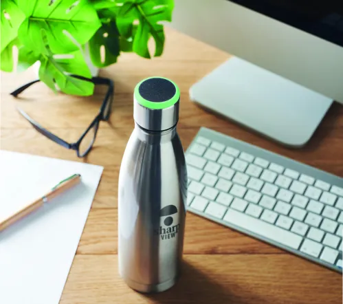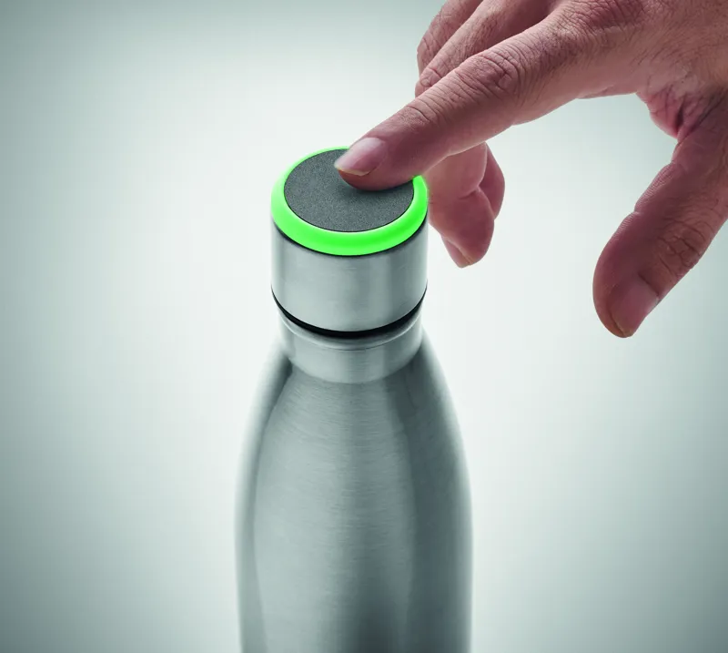 Duplafalú rozsdamentes acél palack hidratációs emlékeztetővel. A kupakba épített fény óránként világít, emlékeztetve a folyadékbevitelre. A működéshez szükséges 1 db CR2032 elemmel szállítjuk. Űrtartalom: 500 ml.