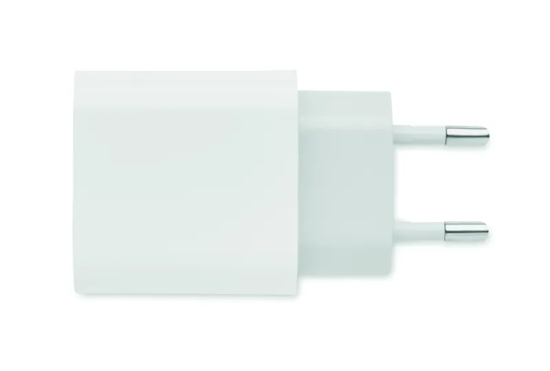 2 pólusú EU töltő. Támogatja a 18 W és a Quick Charge 3.0 / Power Delivery gyorstöltési technológiát. USB-A és C típusú portokkal. Az Egyesült Királyságban való használatra nem alkalmas.
