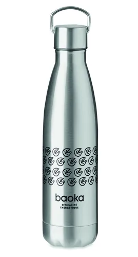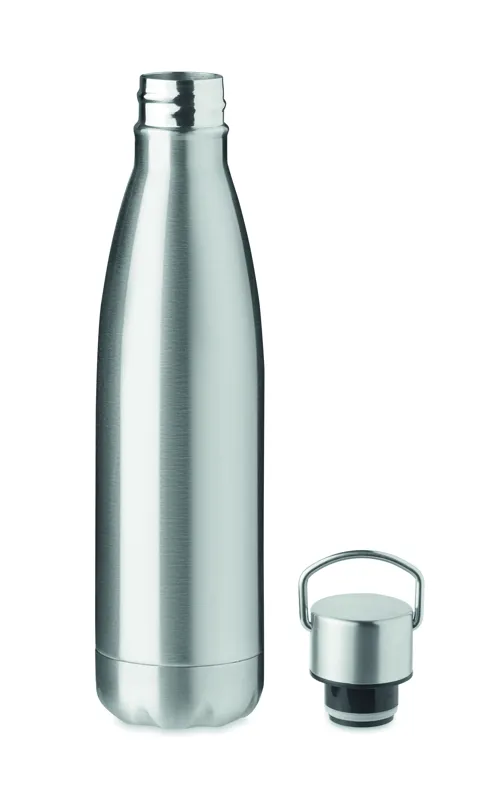 Duplafalú rozsdamentes acél palack, fogantyúval ellátott fedéllel. Szivárgásmentes. Űrtartalom: 500 ml.