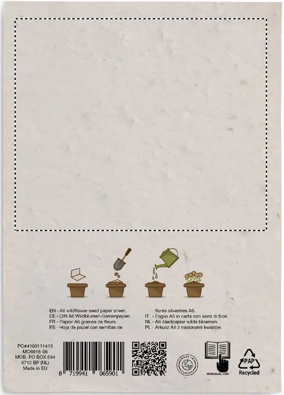 Vadvirág magokat tartalmazó újrahasznosított papírlap A6-os méretben (80 gr/m²). EU-ban gyártva.