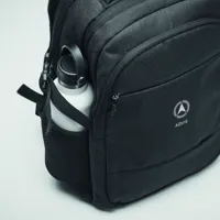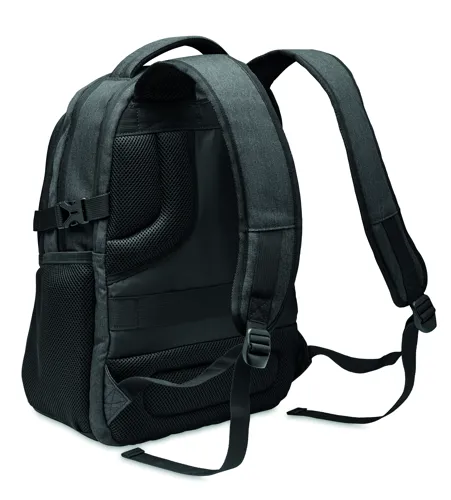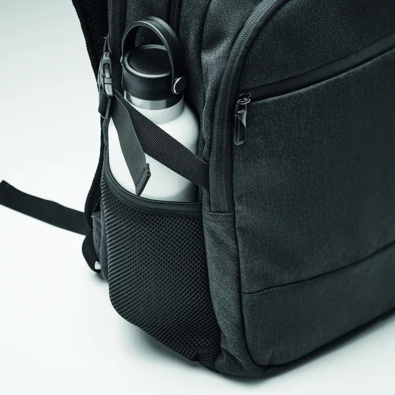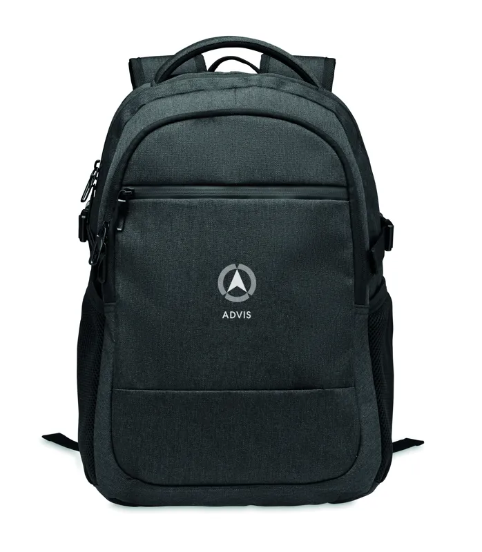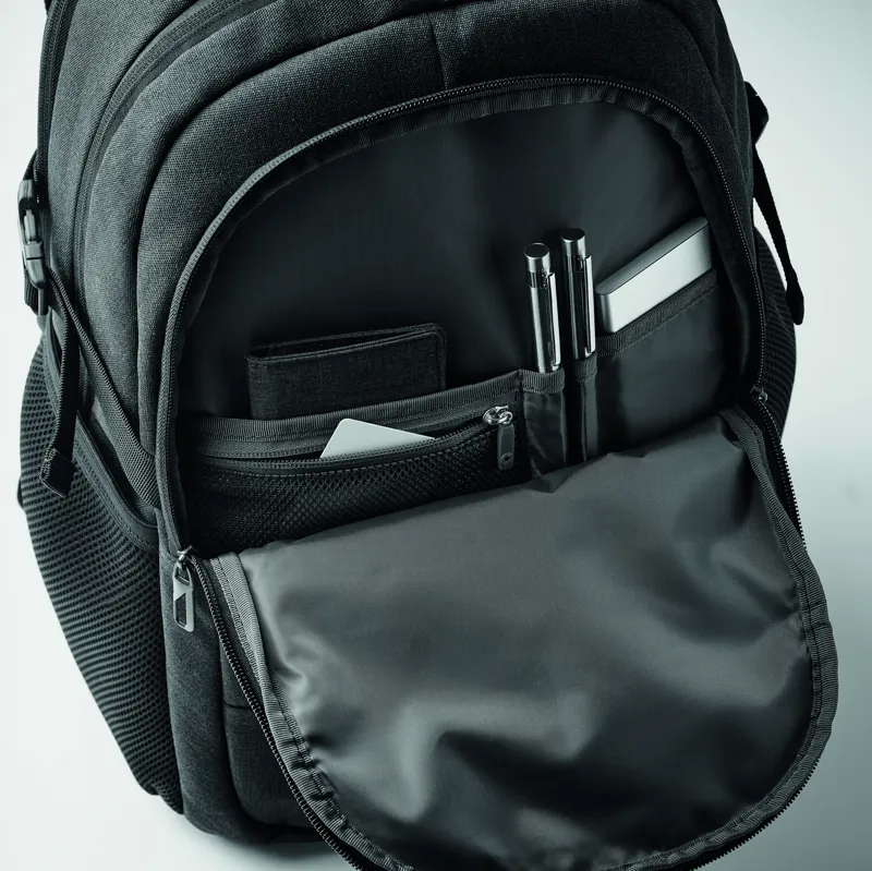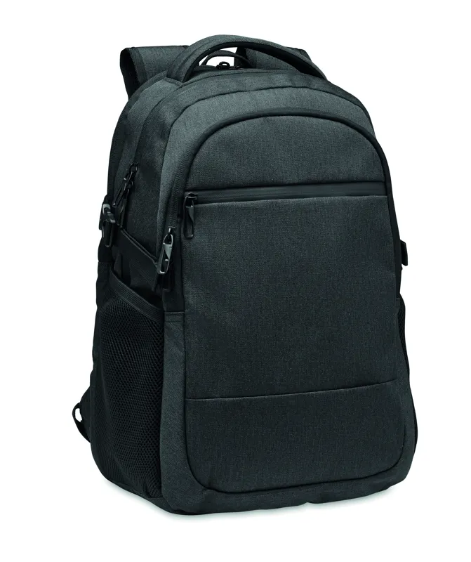 15 colos laptop hátizsák 600D RPET poliészterből. 3 nagy cipzáras, teljesen párnázott külső rekesz, több belső zseb. Két oldalsó hálós zseb. Állítható vállpántok. Szellőző, párnázott, hálós hátoldal. Hátoldalán gurulós bőröndre illeszkedő pánttal.