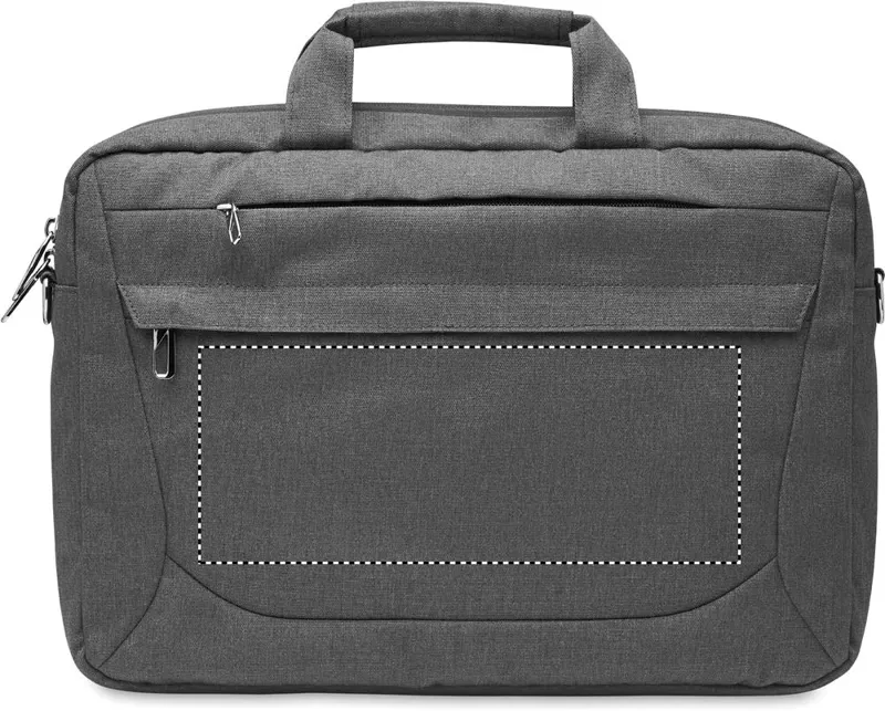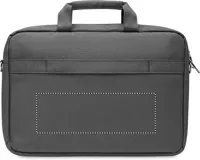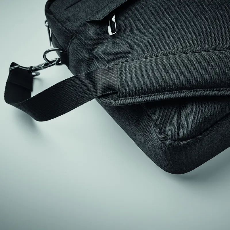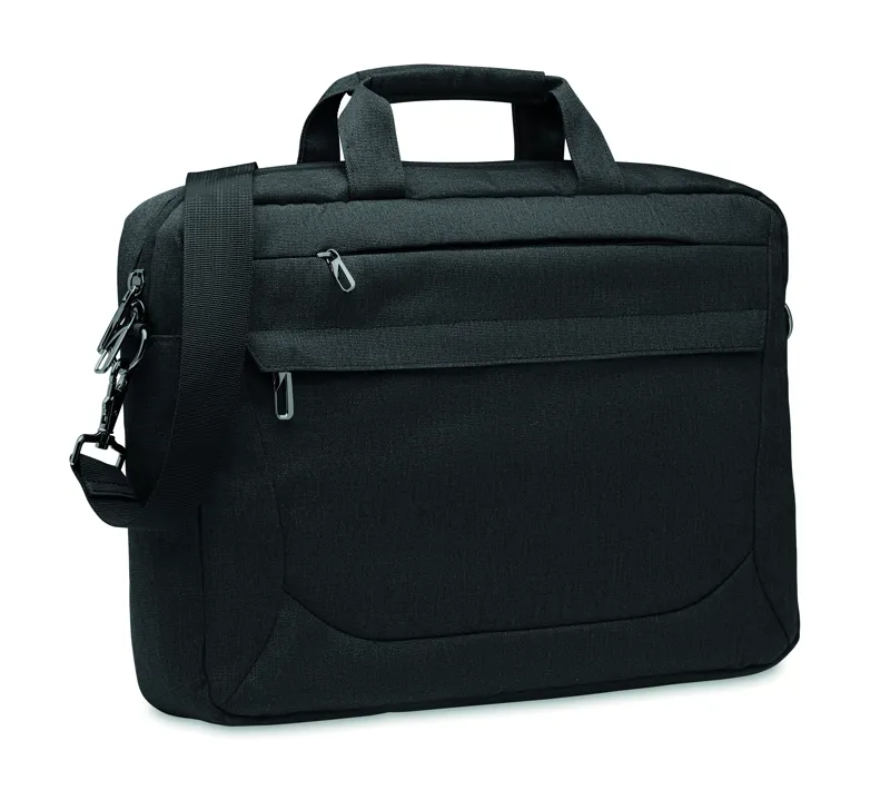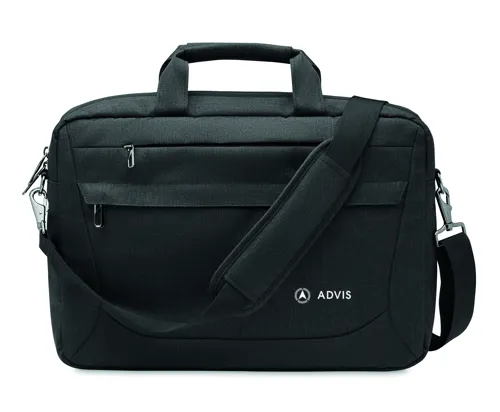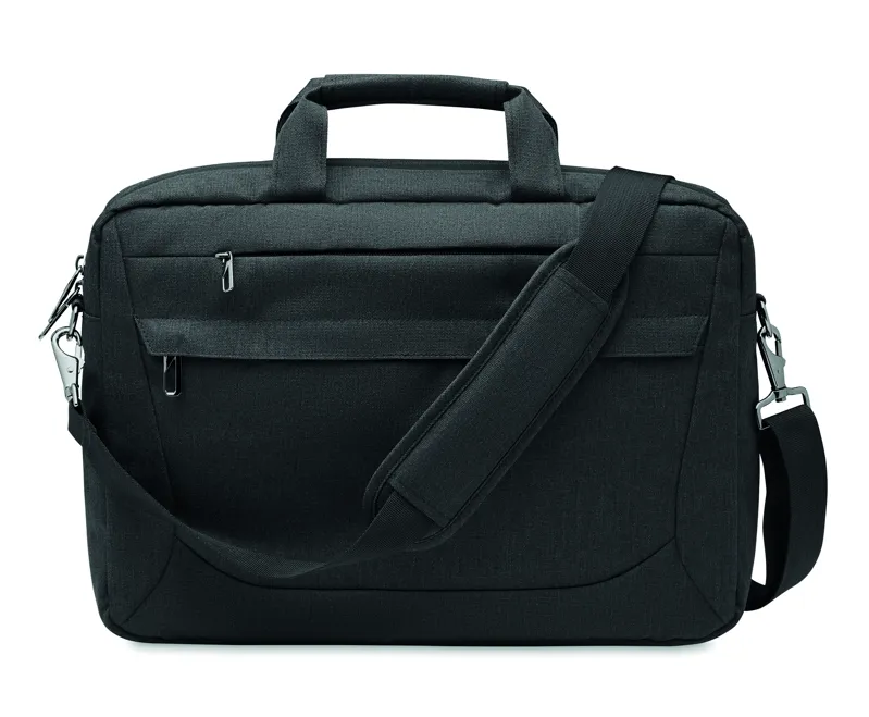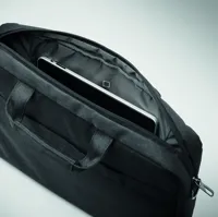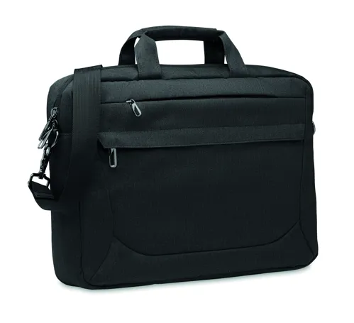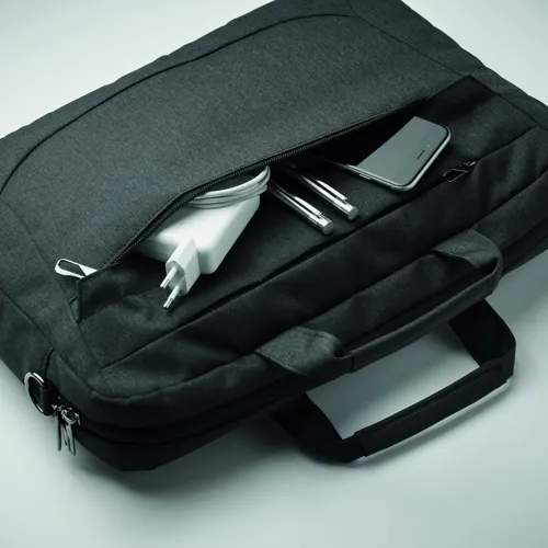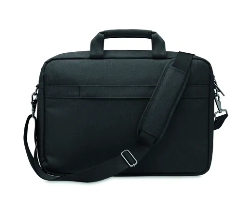 15 colos laptop táska 600D RPET poliészterből. 2 fő belső rekesz laptop vagy táblagép számára és nagy cipzáras elülső zseb, egy kis cipzáras zseb. Levehető és állítható vállpánt. Hátoldalán gurulós bőröndre illeszkedő pánttal.