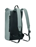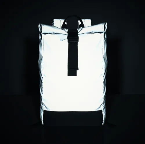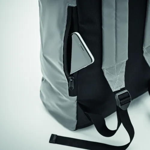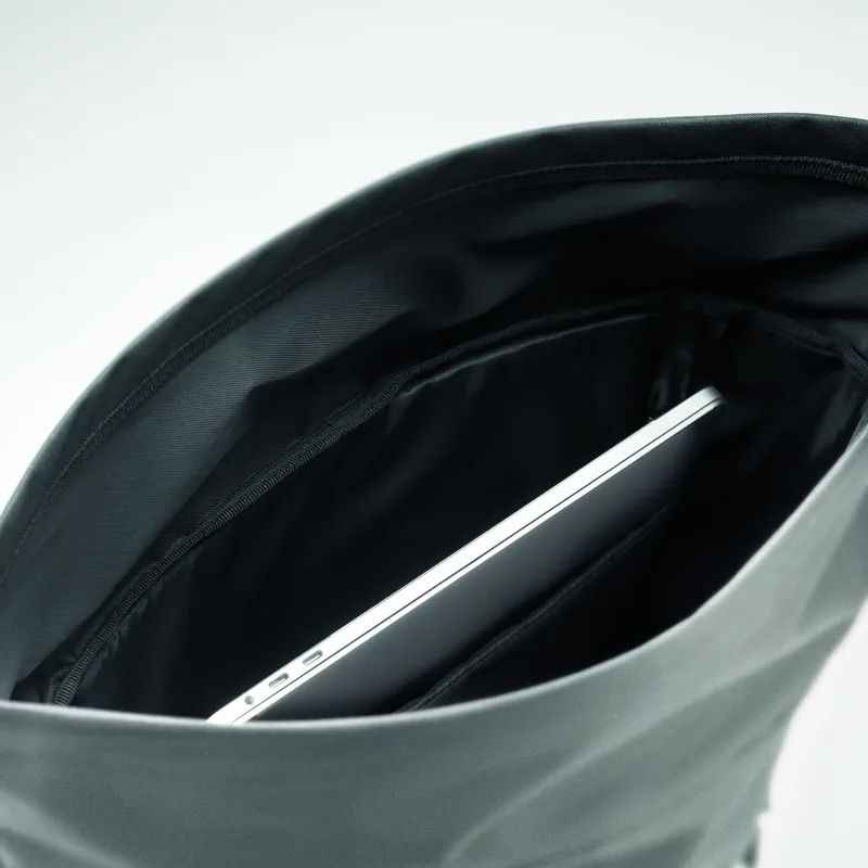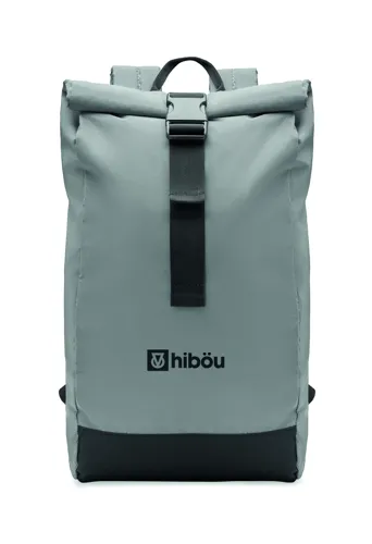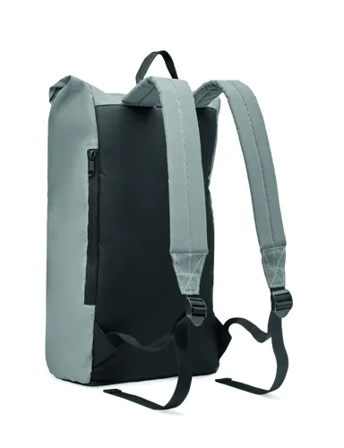 Roll top csavart záródású 15 colos laptop hátizsák magas fényvisszaverő képességű 190T poliészterből. Párnázott hát, alj, vállpántok, elülső cipzáras zseb. Alsó rész 600D újrahasznosított poliészterből.