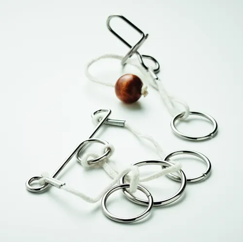 2 részes, 2 és 4 darabból álló fém, fa és pamutzsinór ördöglakat fejtörő készlet. Újrahasznosított papírdobozban szállítjuk.