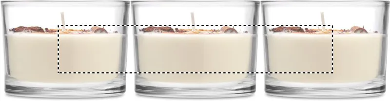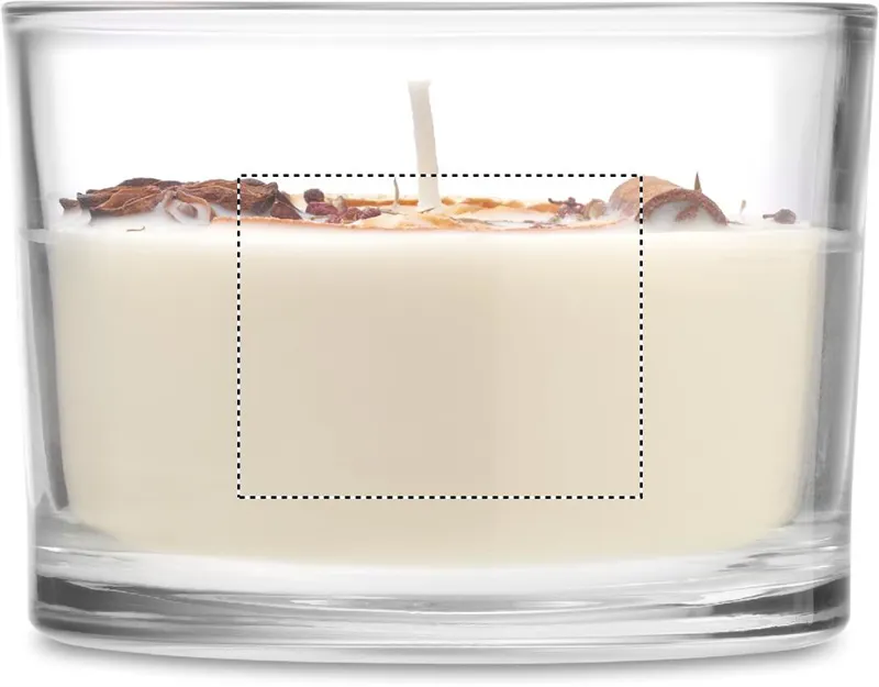 Illatosított növényi alapú viaszgyertya szárított virágokkal és gyümölcsökkel, üveg tartóban. 300 g. Égési idő: 50 óra. Illat: Fahéj és citrus.