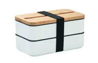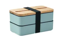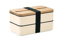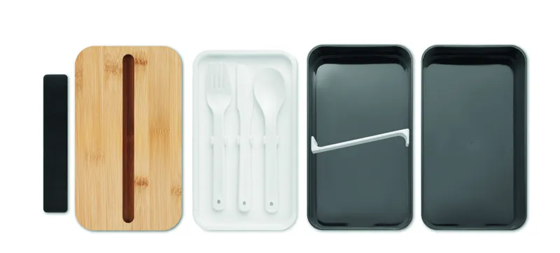 PP kétszintes uzsonnásdoboz kivehető elválasztóval, 3 evőeszközzel, a fedelet rögzítő poliészter pánttal, bambusz fedéllel. A fedélen telefonállvány funkcióval. Űrtartalom: 2 x 400 ml. A bambusz természetes anyag, színében, mintázatában és méretében esetenként eltérő lehet. Szivárgásmentes.