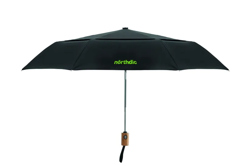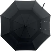 21 colos, 2 szakaszos összecsukható, automatikus nyitású és záródású, szélálló esernyő 70% 190T poliészter és 30% pamut kevert szálas anyagból, alumínium rúddal és cikkelyzáró elemekkel, bambusz markolattal. Fekete üvegszálas bordák. Színben illeszkedő tokban.
