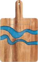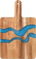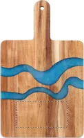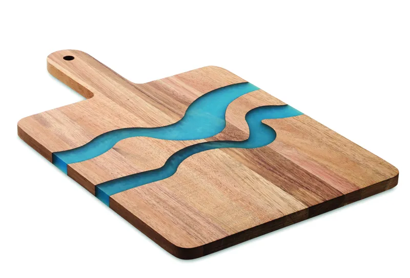 Akáciafa tálalódeszka fogantyúval, dekoratív epoxigyanta részletekkel. A fa természetes anyag, termékenként szín- és méretbeli eltérések jelentkezhetnek, ami befolyásolhatja a dekoráció végső eredményét.