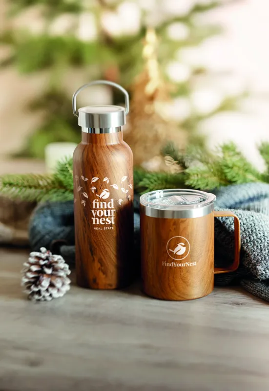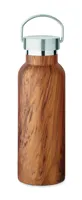 Duplafalú termoszpalack újrahasznosított rozsdamentes acélból (90% újrahasznosított rozsdamentes acél, 10% rozsdamentes acél), fa nyomattal, fogantyúval ellátott fedéllel. Szivárgásmentes. Űrtartalom: 500 ml.