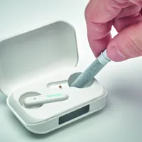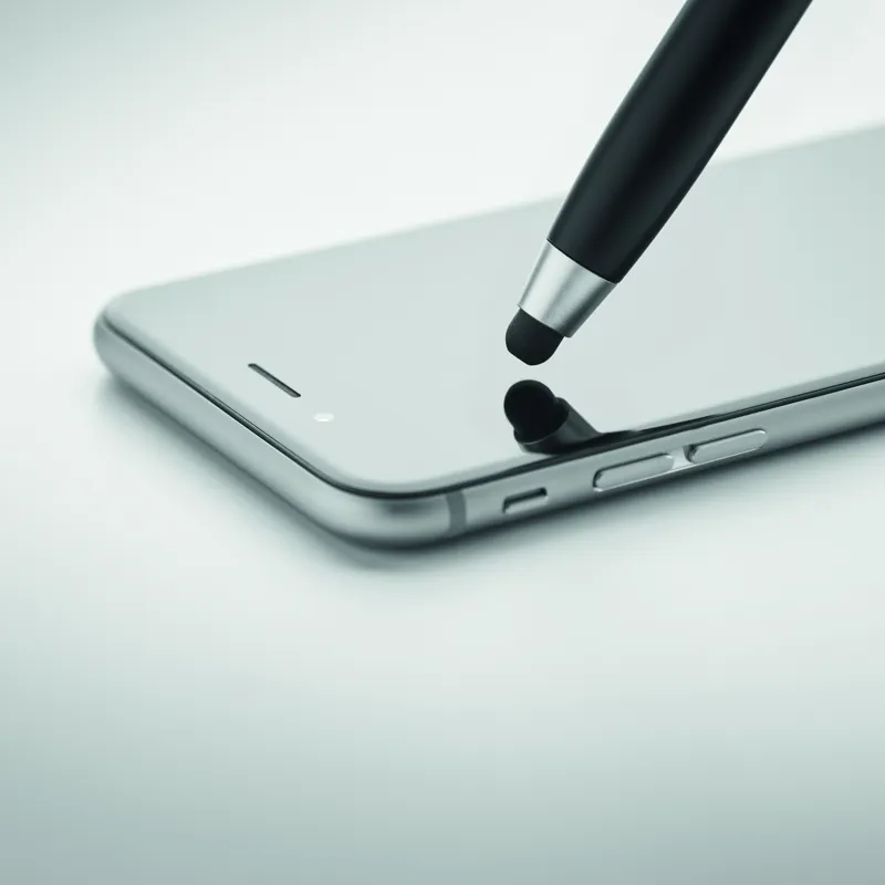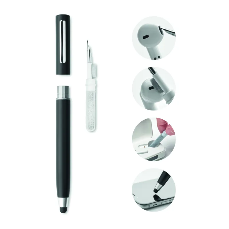 Csavarmechanikás ABS golyóstoll érintőheggyel. A tolltestben TWS (True Wireless Stereo) fülhallgatótisztító készlet található: fém tisztító pálca, szivacs és kefe. Kéken író betéttel.