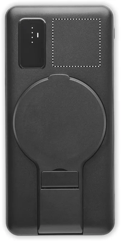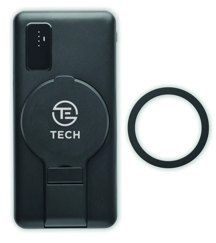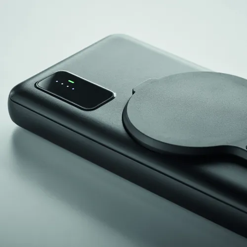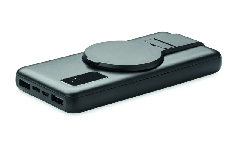 15 W mágneses vezeték nélküli töltő és 10000 mAh power bank ABS-ből, mágneses telefonállvány funkcióval. Bemenet: micro-B és C, kimenet 2x USB-A és C. Teljesítmény: DC 9V/1,66A (15W), ideális gyorstöltéshez. További mágneses fémgyűr#