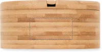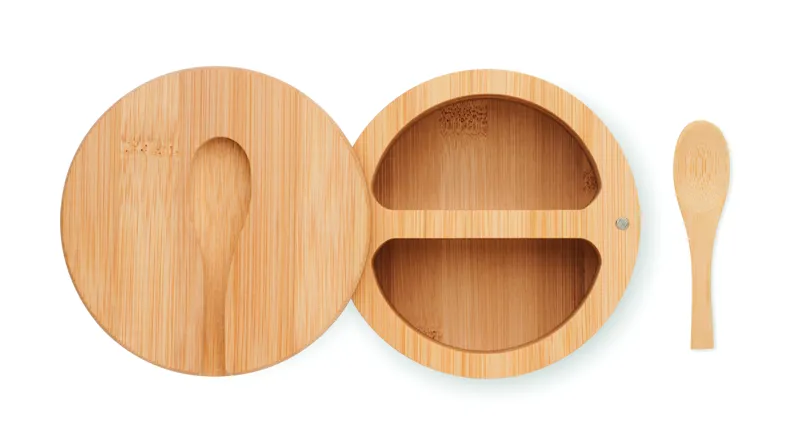 Só- és borstartó bambuszból, beépített kanállal. Két rekesz. Csavaros fedél. A bambusz természetes anyag, színében, mintázatában és méretében esetenként eltérő lehet. Szivárgásmentes.