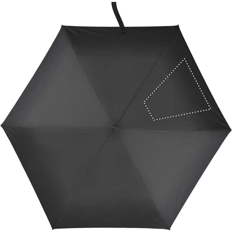 19 colos, 3 szakaszos összecsukható, mini, ultrakönnyű, kézi nyitású és záródású, szélálló esernyő 30D poliészter nyersselyemből, fekete szénszálas rúddal és bordákkal, műanyag cikkelyzáró elemekkel. Hozzáillő tokban. 100 g.