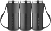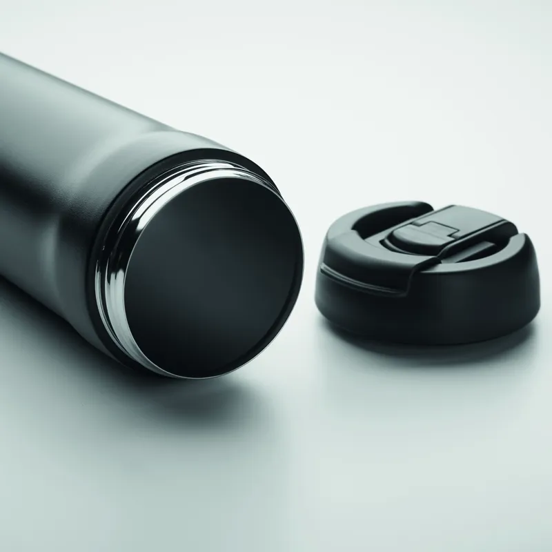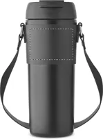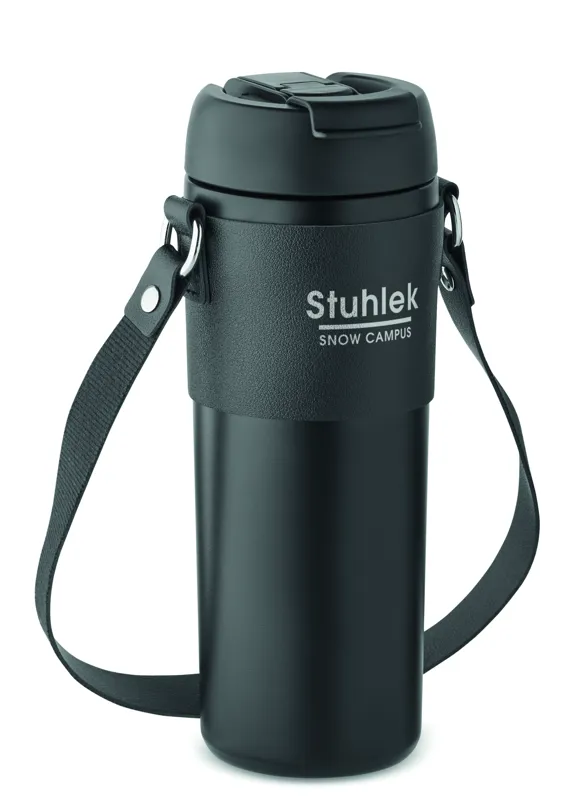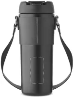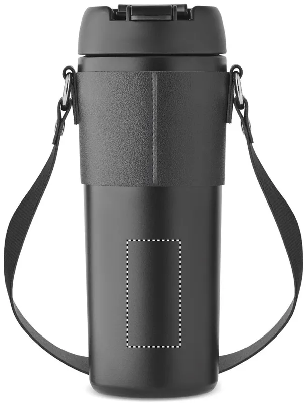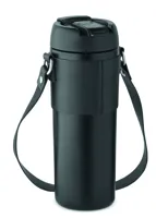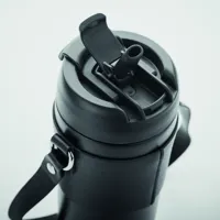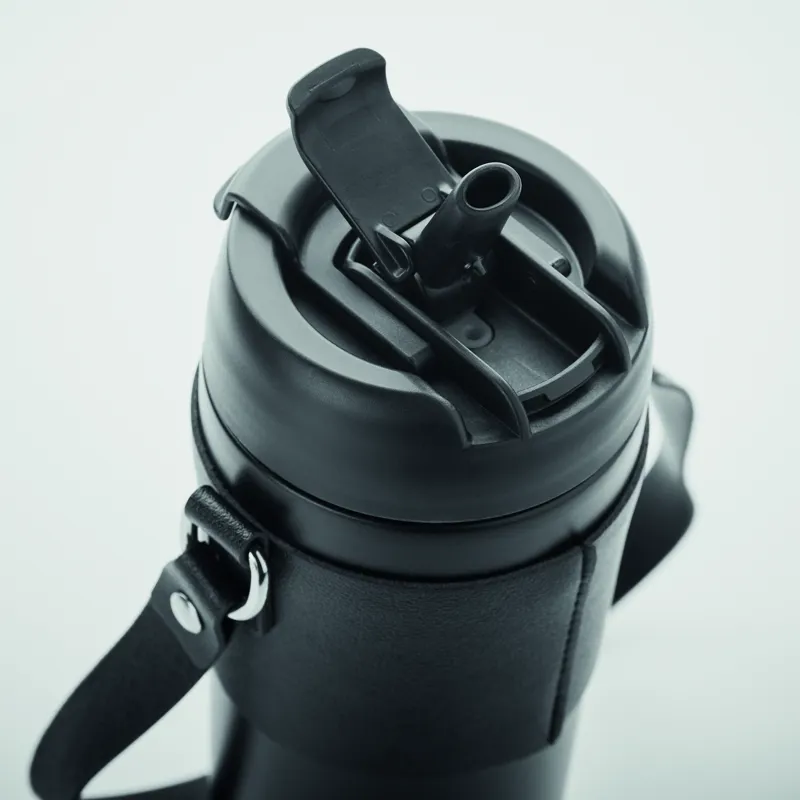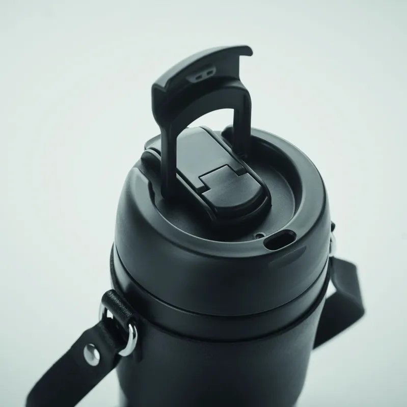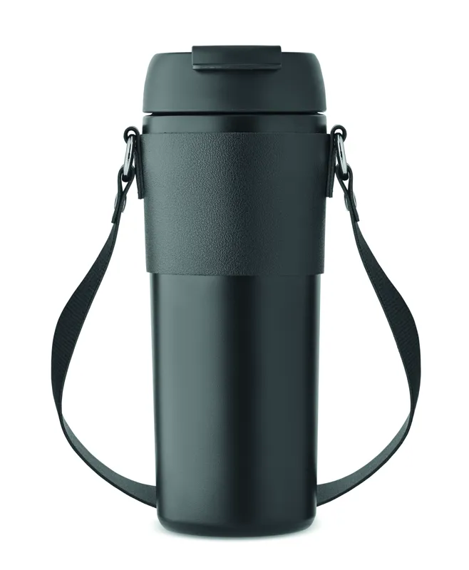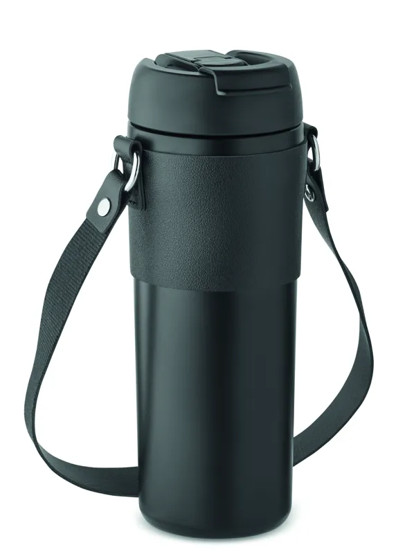 Duplafalú, rozsdamentes acél, porszórt bevonatú pohár, 2 az 1-ben ivónyílással és szívószállal ellátott PP fedéllel, PU hordozószíjjal. Szivárgásmentes. Űrtartalom: 700 ml.