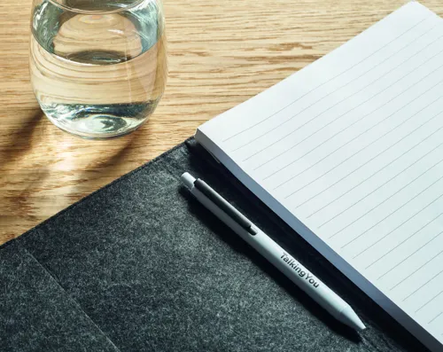 A4 konferencia mappa RPET filcből. 100 lapos, vonalas, újrahasznosított papírból készült jegyzettömbbel, rugalmas tolltartó hurokkal.