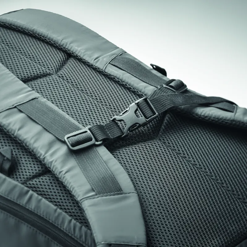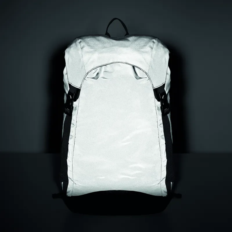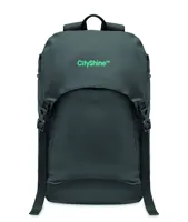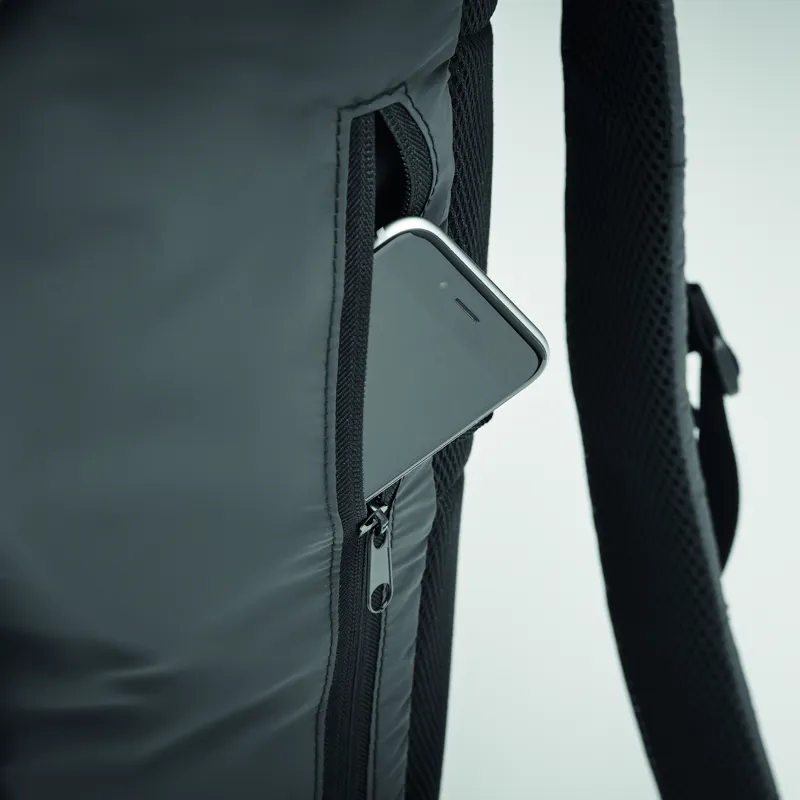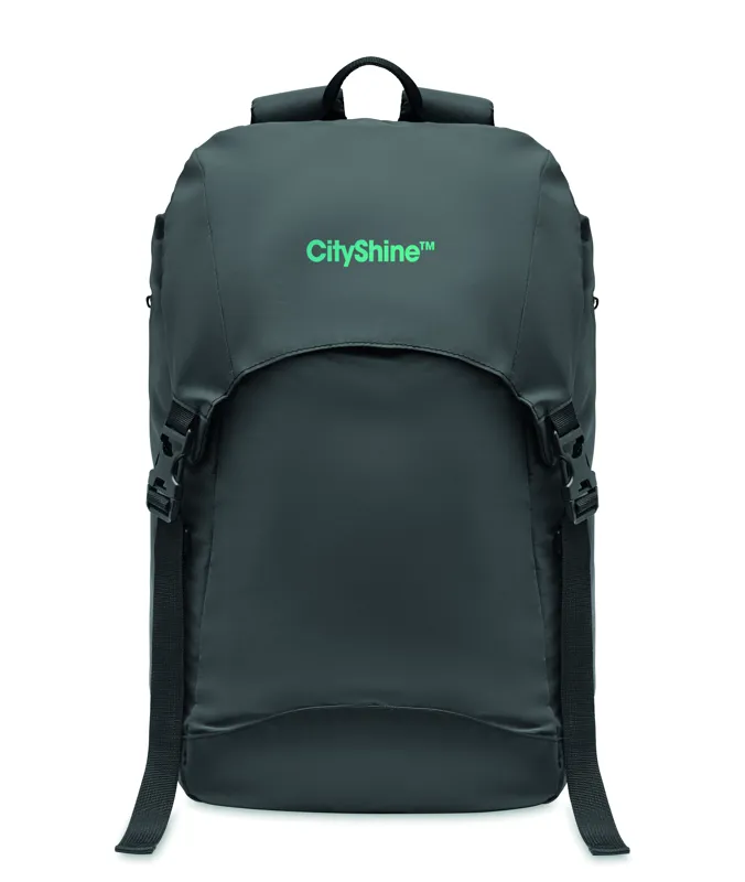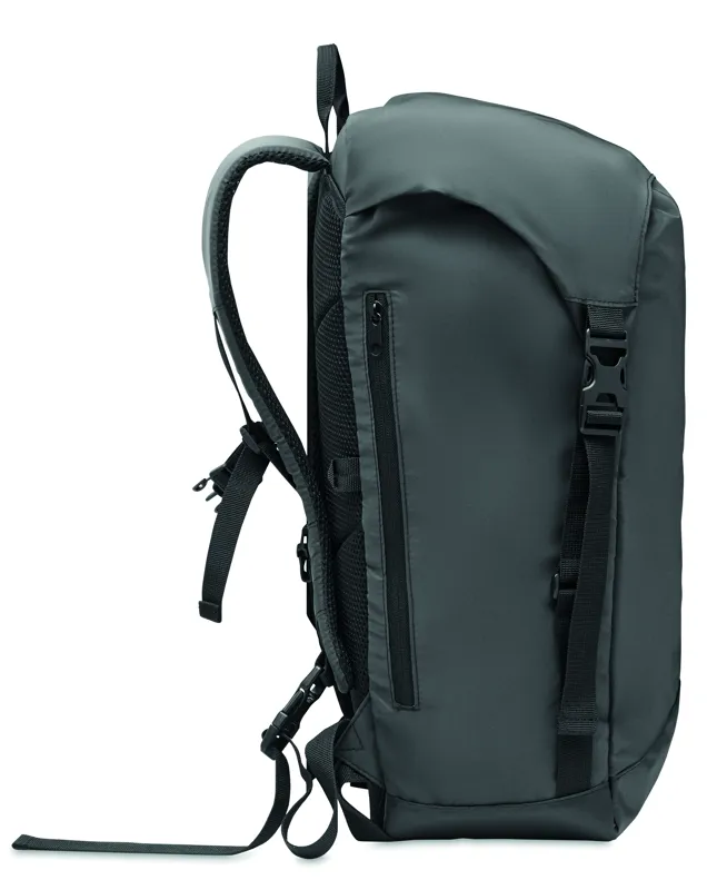Fényvisszaverő granulátummal bevont 190T poliészterből készült túra hátizsák. Cipzáras külső oldalzseb és párnázott hátrész, húzózsinórral zárható belső rész. Egy nagy, párnázott belső laptoprekesz. Állítható, párnázott vállpántok, állítható mell- és hashevederek csatos záródással. Vízlepergető.