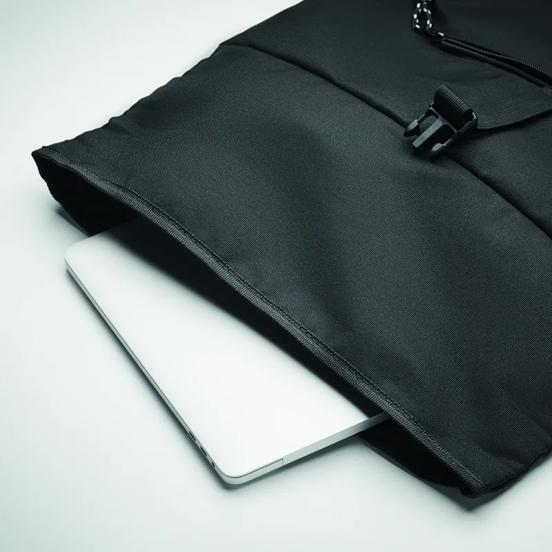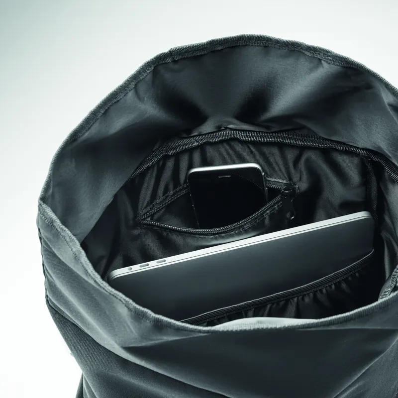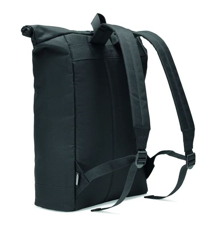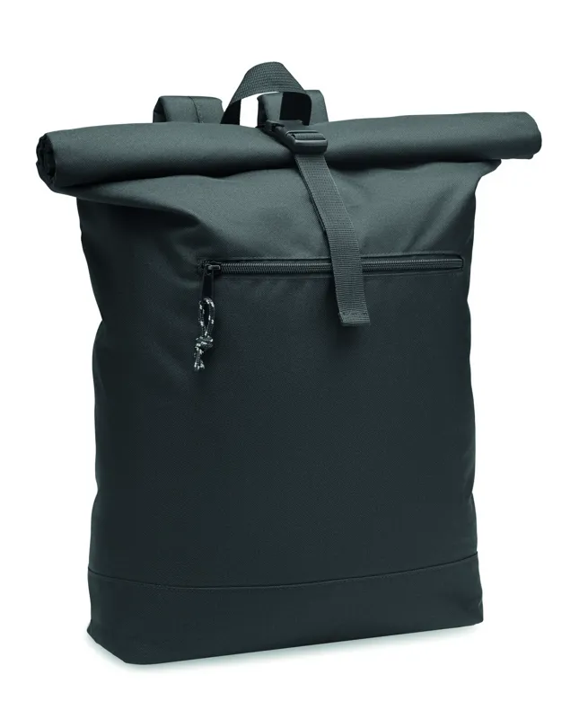 Roll top csavart záródású hátizsák 600D RPET poliészterből, párnázott háttal és aljjal. Cipzáras elülső zseb. 210D RPET bélés.