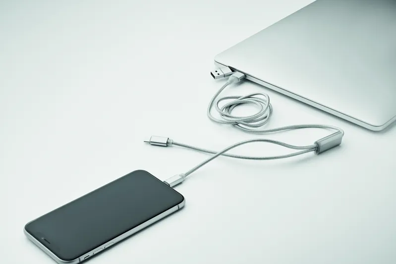 Alumínium töltőkábel 2 az 1-ben C-típusú, USB-A és mikro USB-B bemenetel, C-típusú és mikro USB-B kimenettel. Kábel hossza: 120 cm.