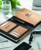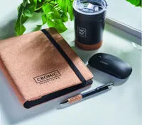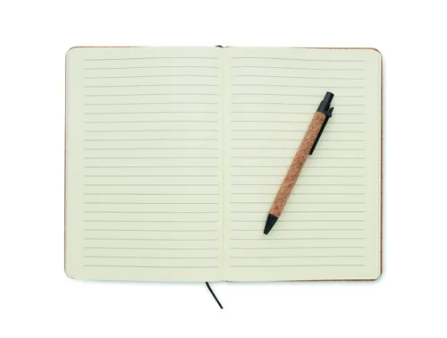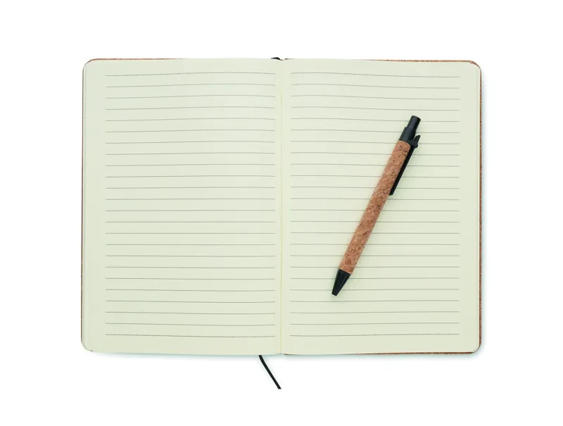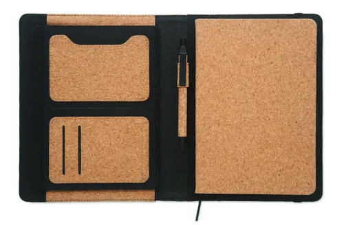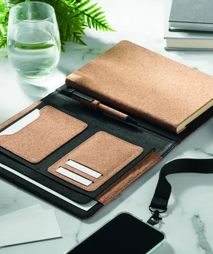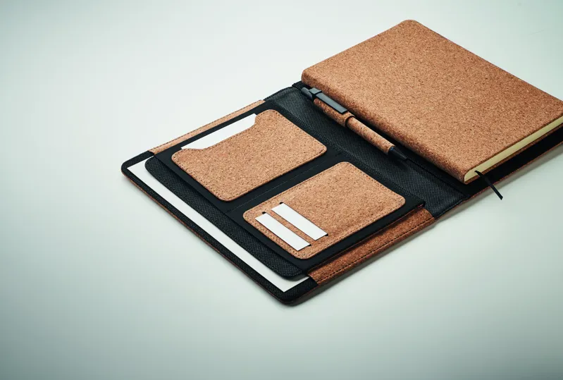 A5 parafa mappa. Cserélhető A5 jegyzetfüzet parafa keménytáblás borítóval. Cérnafűzött. 192 vonalas, újrahasznosított papír oldal (96 lap). Illeszkedő színű toll és tolltartó hurok. 2 kártyatartó és egy nagy rekesz. Elasztikus zárópánt.