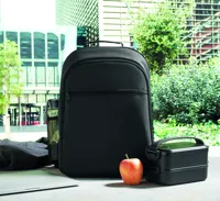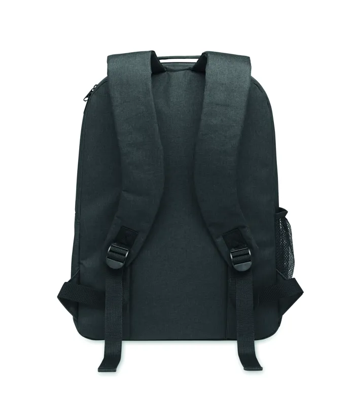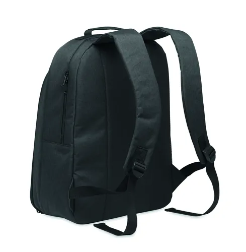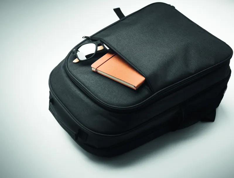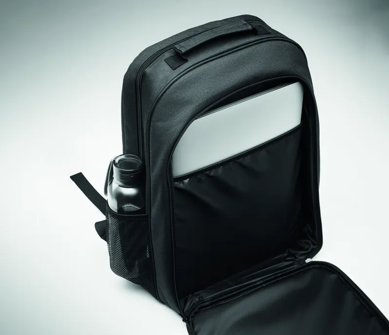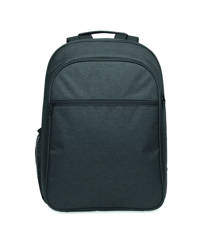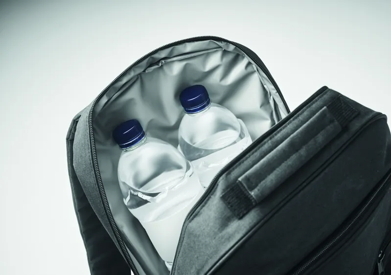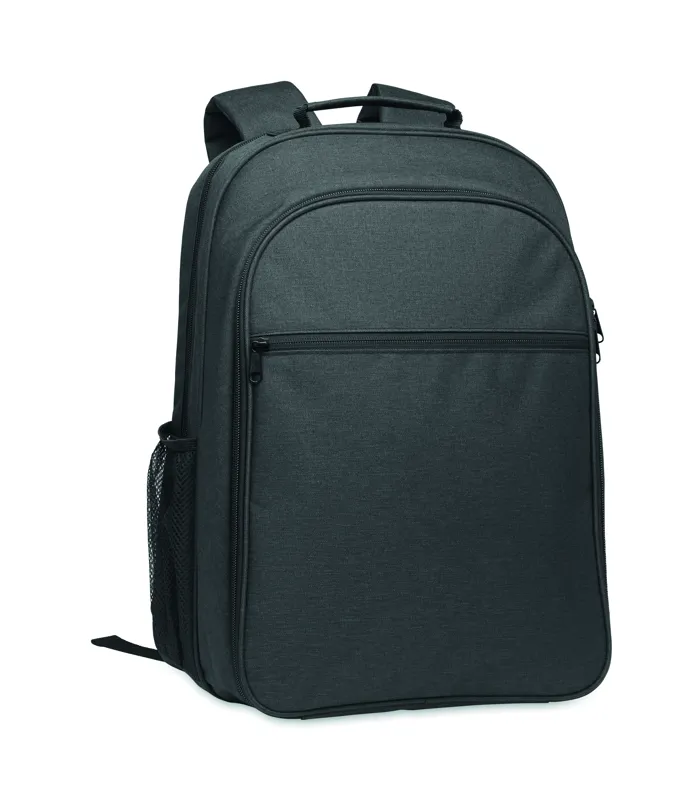 300D RPET hűtőtáskás hátizsák 15 colos laptop rekesszel. Elülső cipzáras zseb és egy oldalsó hálós rekesz.