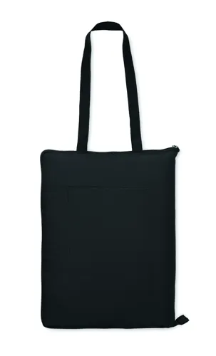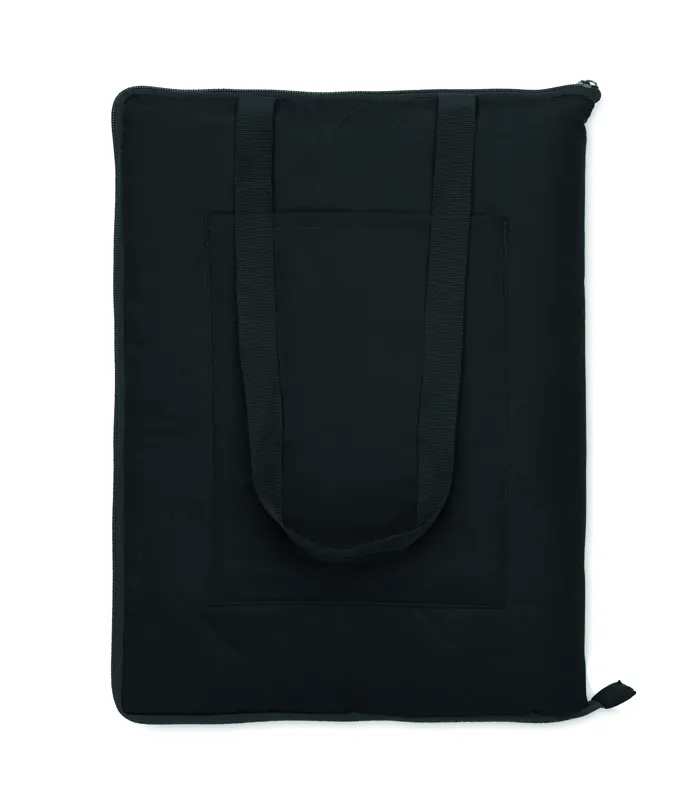 Összehajtható steppelt pikniktakaró műanyaggal bevont PEVA-val a hátoldalon. Összehajtható egy kényelmes, állítható vállpántos hordtáskává, nagyméretű zsebbel az elülső oldalon.