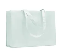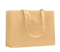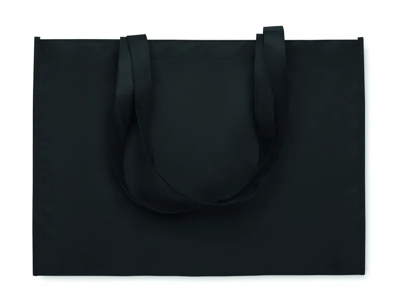 Bevásárló- vagy strandtáska RPET nem szőtt anyagból, oldalsó toldással és hosszú fogantyúval. 80 g/m².