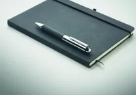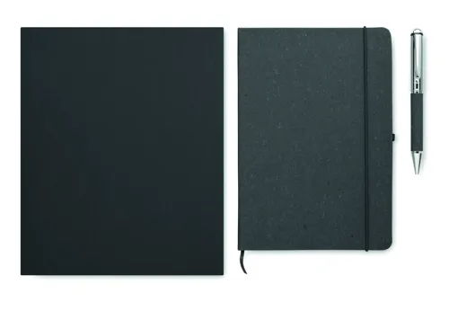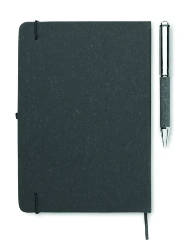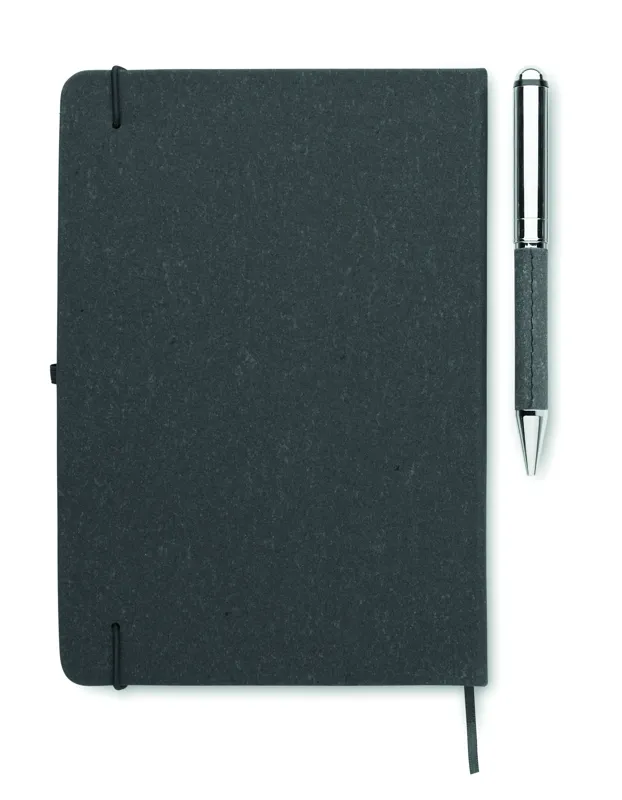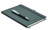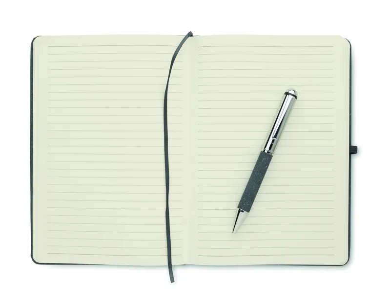 Ajándékszett. A5 jegyzetfüzet 75%-ban újrahasznosított bőrből készült keménytáblás borítóval. Cérnafűzött. 160, újrahasznosított papírból készült, vonalas oldal (80 lap). Egyező színű elasztikus zárópánt, tolltartó hurok és könyvjelző szalag. Egyező színű csavarmechanikás fém golyóstoll. Kéken író betéttel. Kraftpapír dobozban. FSC®-certified | FSC MIX CREDIT, P7.1, FSC-C213206