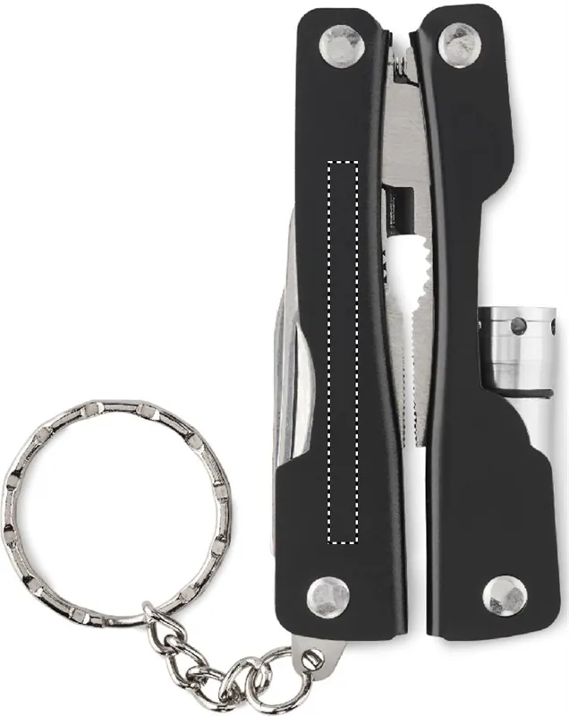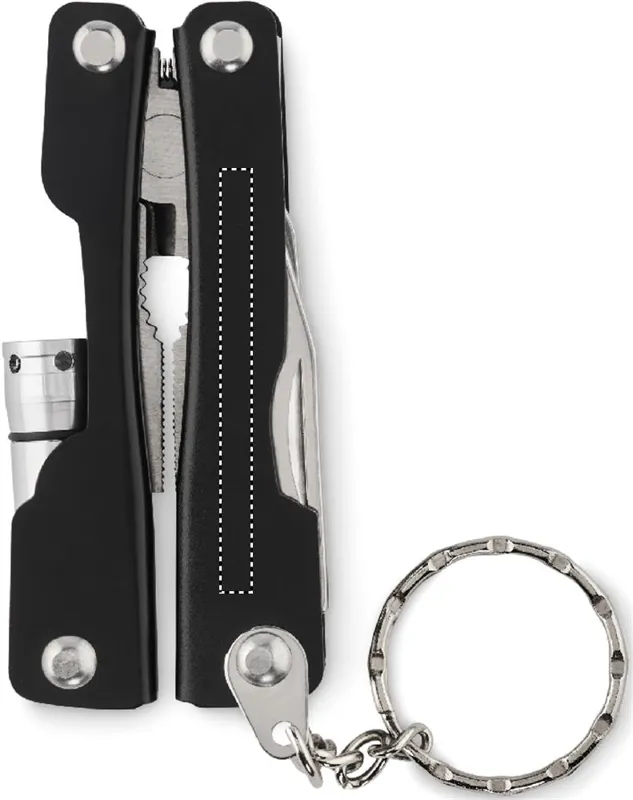 Összecsukható multifunkciós szerszám zseblámpával, rozsdamentes acélból. 10 szerszám funkcióval, 600D poliészter tokban. A működéshez szükséges 3 db AG3 gombelemmel szállítjuk.