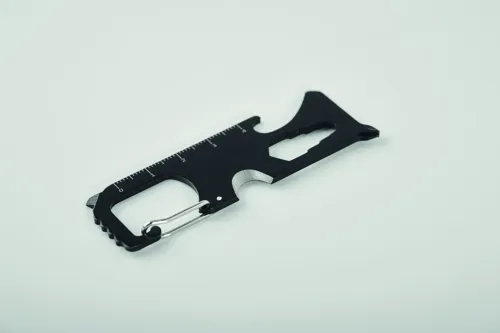 Rozsdamentes acélból készült multifunkciós zsebméretű szerszám. 8 funkcióval. Tartalmaz: fűrész, drótvágó, villáskulcs, csillag- és lapos csavarhúzó, mérőskála, üvegnyitó és kulcstartó.