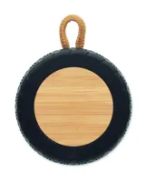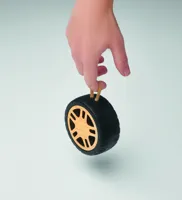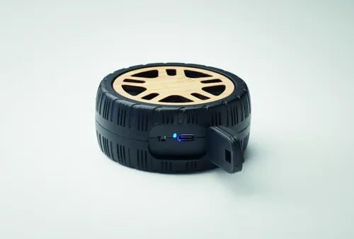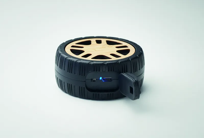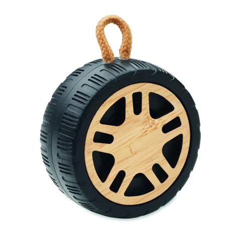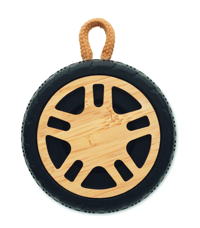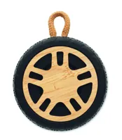 Autókerék alakú 5.3 vezeték nélküli 3W hangszóró újrahasznosított ABS- ből, bambusz részletekkel és pamut kötél fogantyúval. 400 mAh újratölthető akkumulátorral.