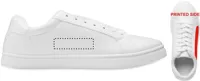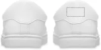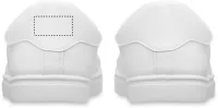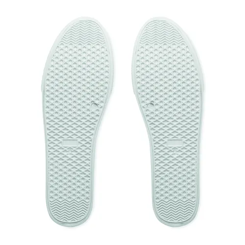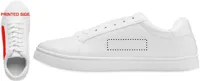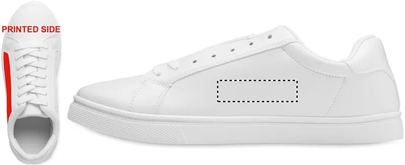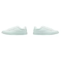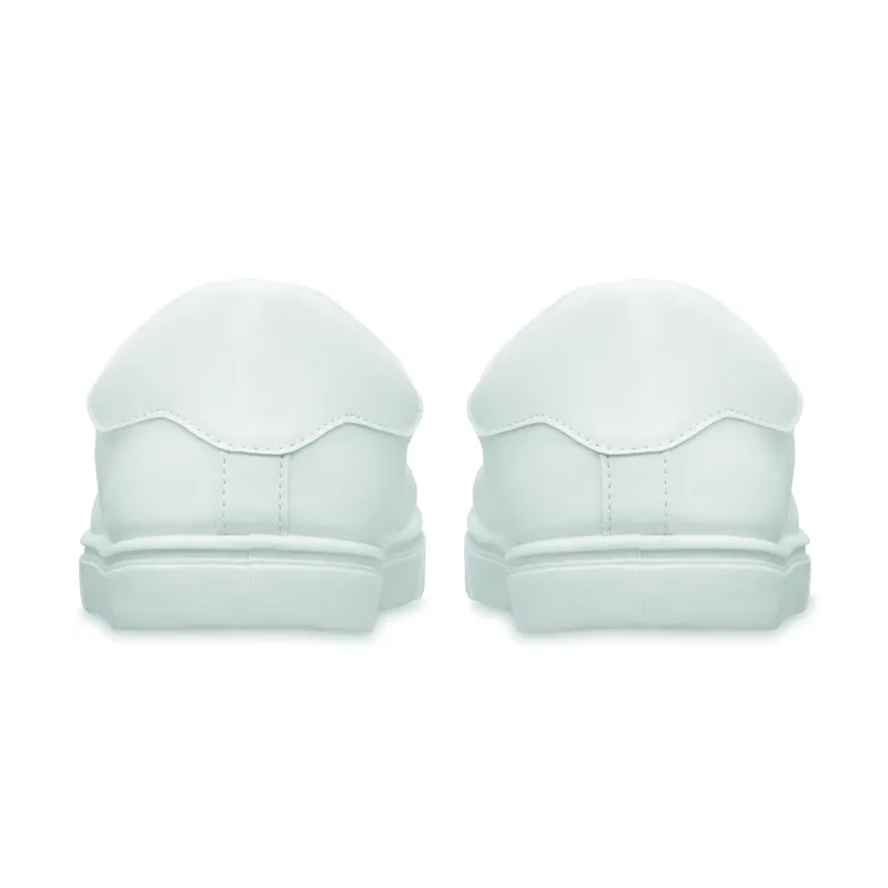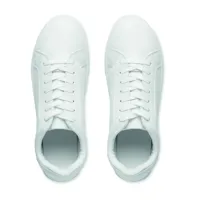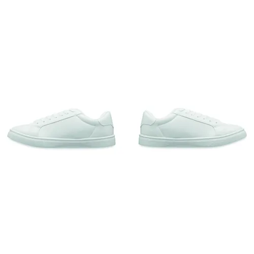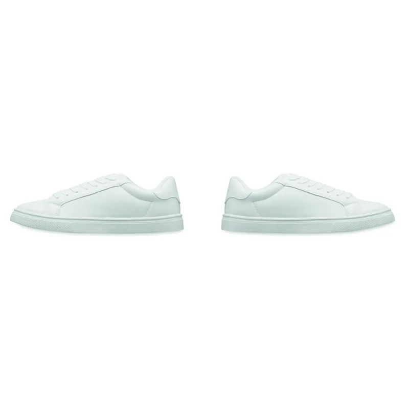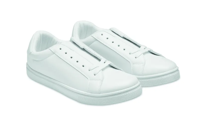 Könnyű PU tornacipő gumi talppal és poliészter fűzővel. Méret: 46. Fehér cipősdobozban. A tornacipőt csak az első 2 fűzőlyukba fűzött cipőfűzővel szállítjuk.