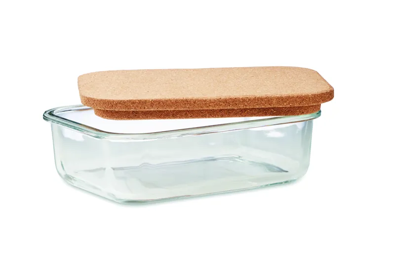 Boroszilikát üvegből készült uzsonnás- vagy ételtartó doboz parafa fedéllel és szilikon pánttal. Űrtartalom: 830 ml.