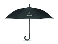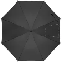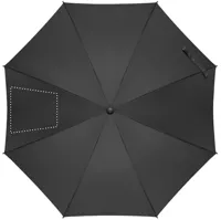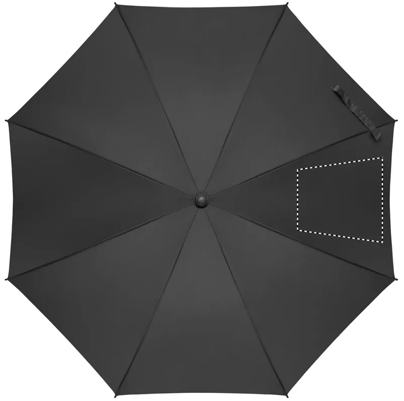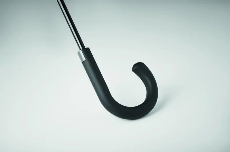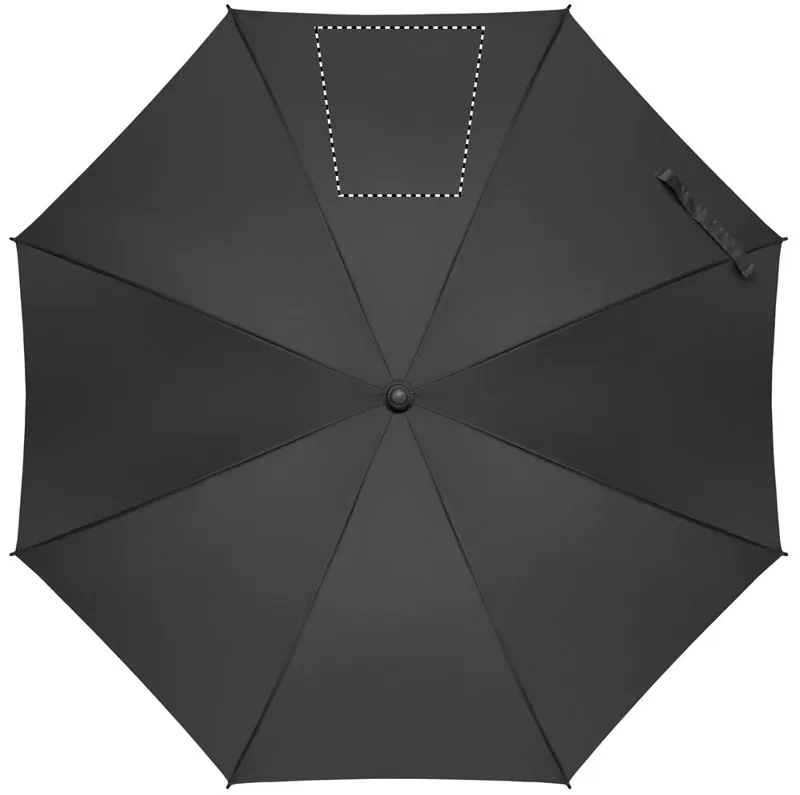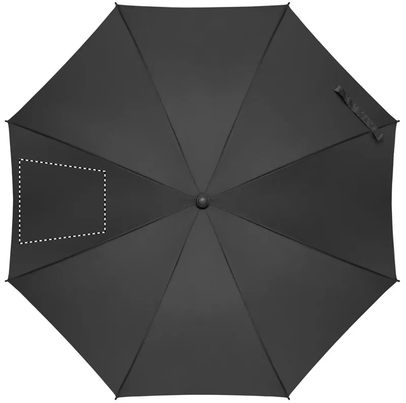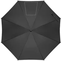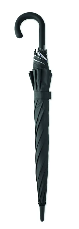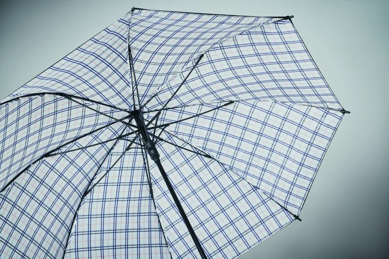 23 colos, automatikus nyitású, szélálló esernyő 190T pongee nyersselyem anyagból, a belső oldalán kockás mintával. Üvegszálas váz, fekete bevonatos rúd és műanyag cikkelyzáró elemek. Hajlított, gumírozott markolat. Manuális záródás.