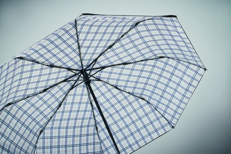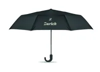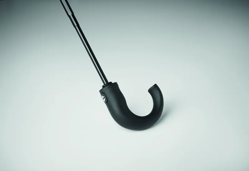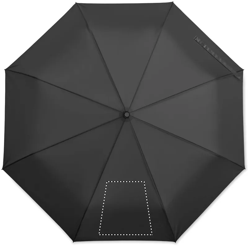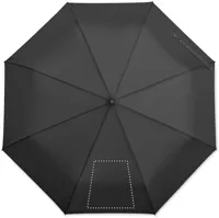23 colos, 3 szakaszos összecsukható, szélálló esernyő, kétrétegű 190T pongee nyersselyem anyagból, belül kockás mintával, automatikus nyitással és záródással. Fekete bevonatos rúd, kétszekciós fekete üvegszálas váz. Hajlított gumírozott ABS markolat.