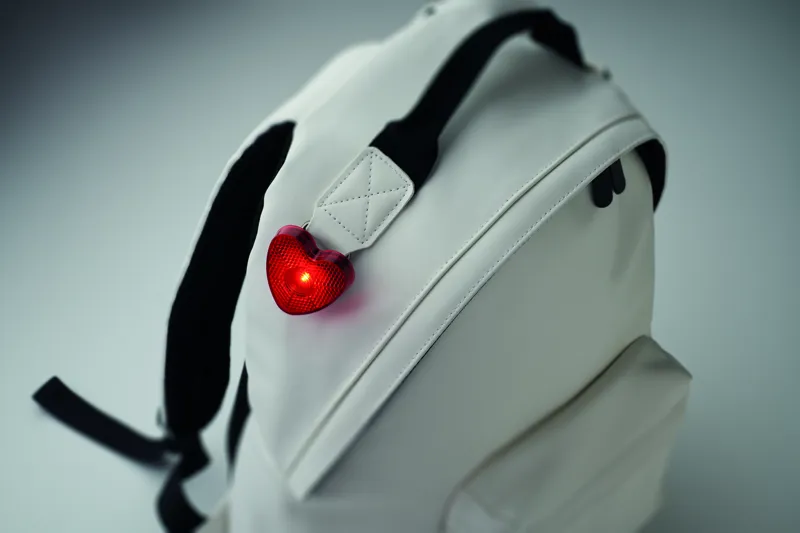 Szív alakú fényvisszaverő piros lámpa ABS-ből, csíptetővel a hátoldalán. Két üzemmód: világítás és villogó. A működéshez szükséges 2 db cserélhető LR44 elemmel szállítjuk.