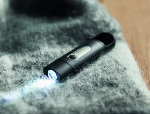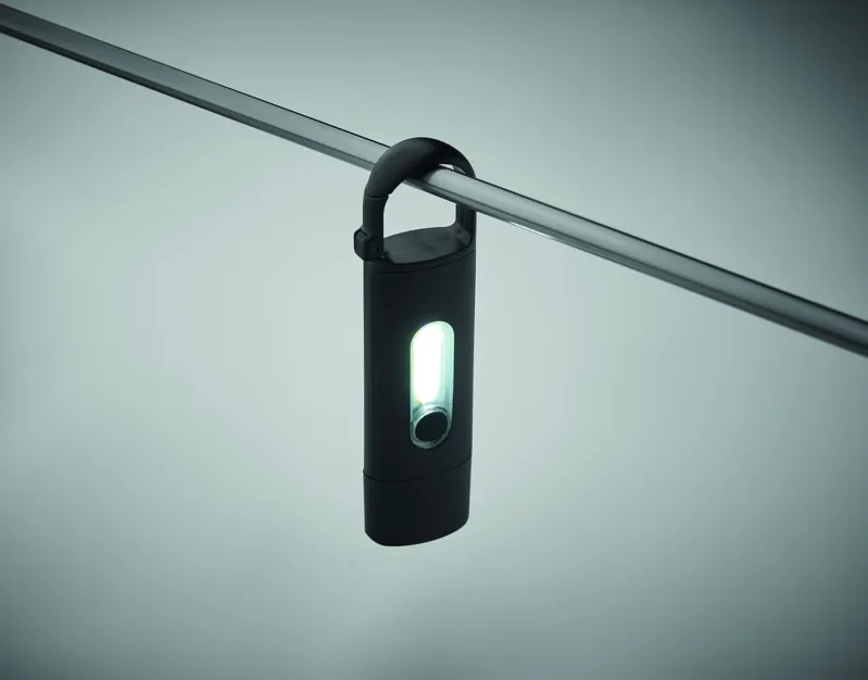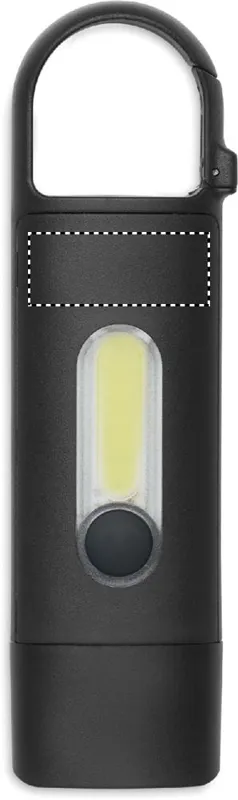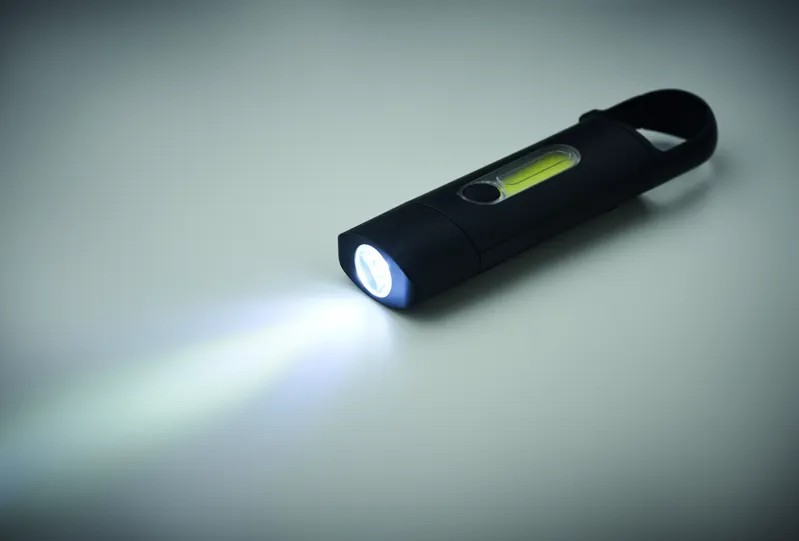Kisméretű újratölthető COB zseblámpa karabinerrel, ABS-ből. Vészvilágítás és 3 világítási mód. 1 x 3,7 V, 200 mAh lítium beépített újratölthető akkumulátor.