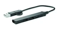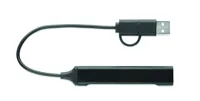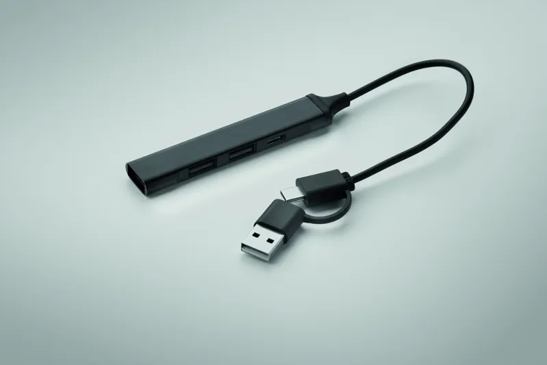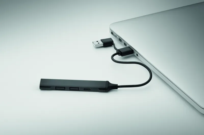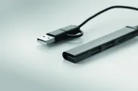 4 portos USB hub újrahasznosított alumíniumból. 3 USB-A + 1 C-típusú. Bemenet: 2 az 1-ben C-típusú és USB-A. Kábel hossza: 19 cm.