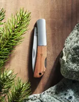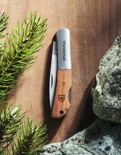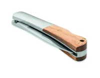 Rozsdamentes acélból készült összecsukható kés akáciafa markolattal. Penge hossza: 6 cm.
