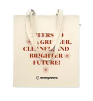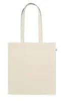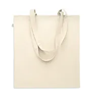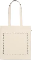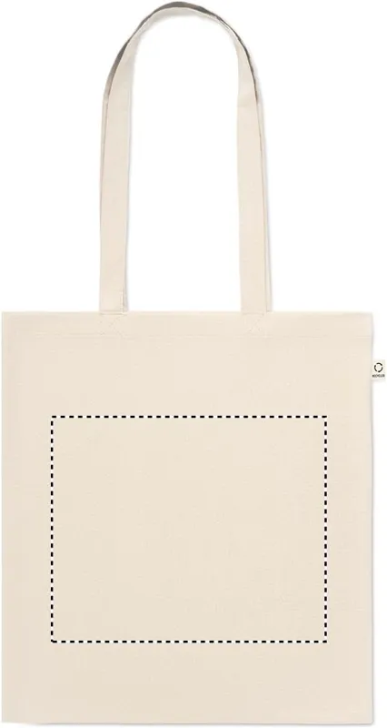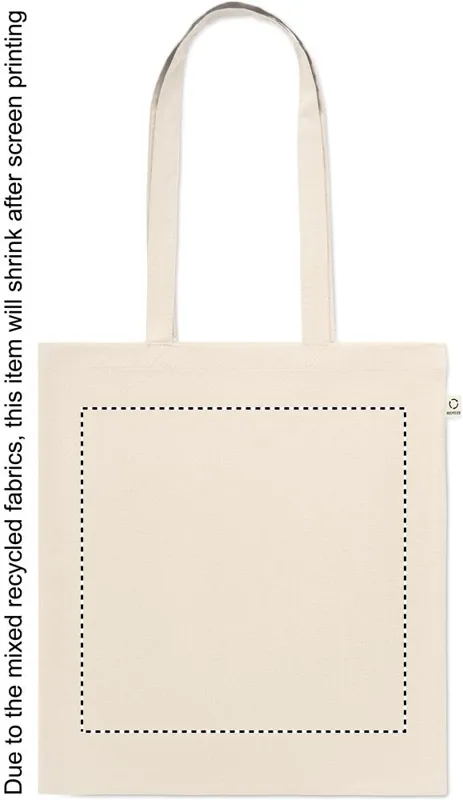 Fogyasztás előtti újrahasznosított pamut bevásárlótáska (70% újrahasznosított pamut és 30% RPET), hosszú fülekkel. 140 g/m². Ez az anyag nyomtatás után zsugorodhat.