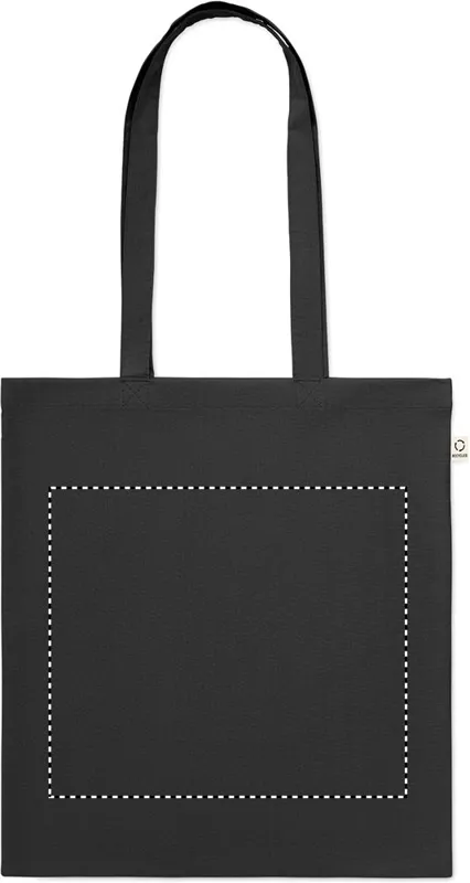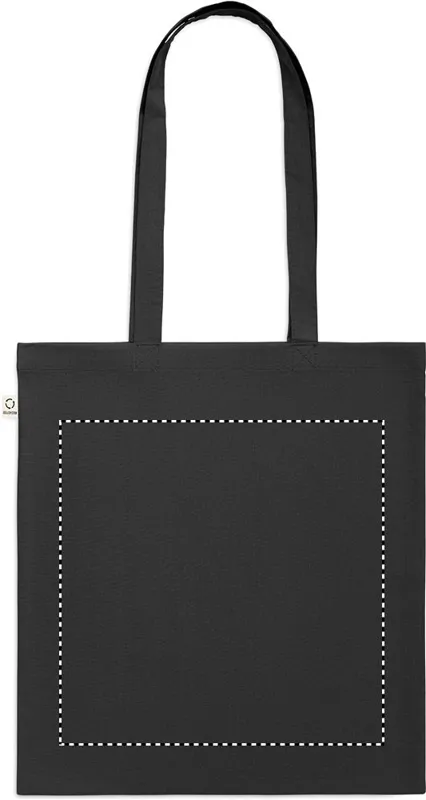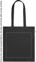 Fogyasztás előtti újrahasznosított pamut bevásárlótáska (70% újrahasznosított pamut és 30% RPET), hosszú fülekkel. 140 g/m². Ez az anyag nyomtatás után zsugorodhat.