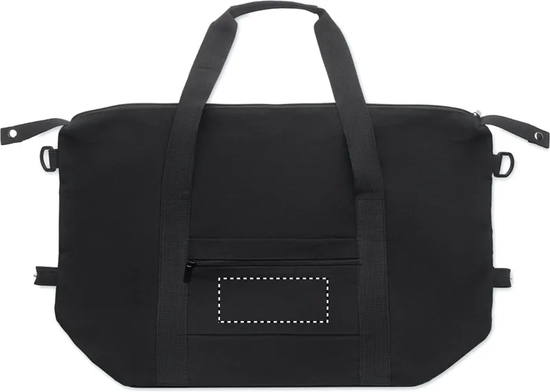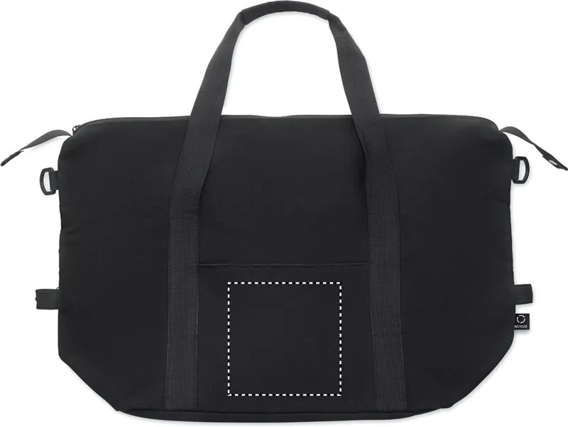 Hétvégi táska 70% újrahasznosított pamutból és 70% újrahasznosított poliészterből, 210D RPET poliészter béléssel. Elülső nyitott zsebbel, cipzáras hátsó zsebbel, levehető és állítható vállpánttal, párnázott aljjal. Hátoldalán gurulós bőröndre illeszkedő pánttal.