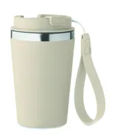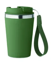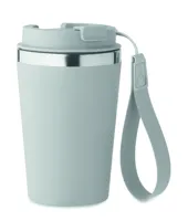 Duplafalú pohár újrahasznosított rozsdamentes acélból (90% újrahasznosított rozsdamentes acél és 10% rozsdamentes acél), PP külső réteggel, RPET csuklópánttal. Űrtartalom: 350 ml.