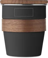 Szimplafalú pohár újrahasznosított rozsdamentes acélból (90% újrahasznosított rozsdamentes acél és 10% rozsdamentes acél), diófa markolattal és fedéllel. Űrtartalom: 350 ml. A mosogatáshoz távolítsa el a markolatot. Mivel ez egy szimplafalú bögre, hőátadás lehetséges.
