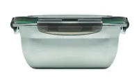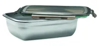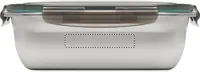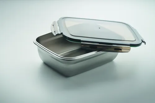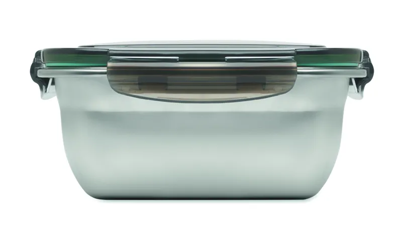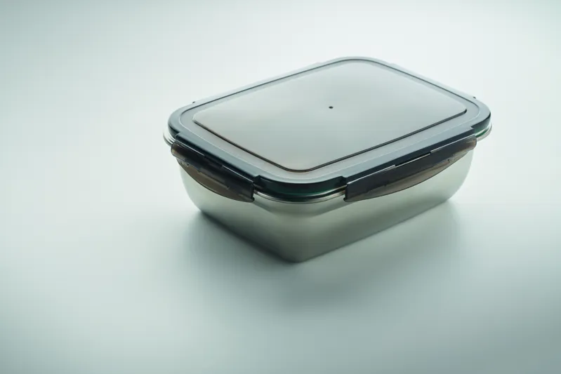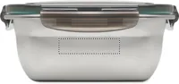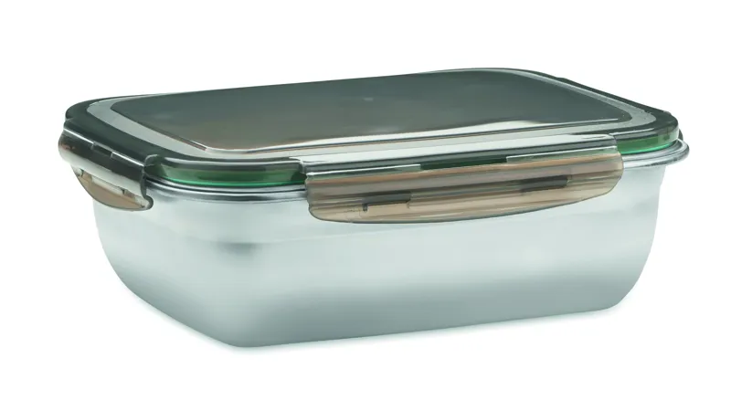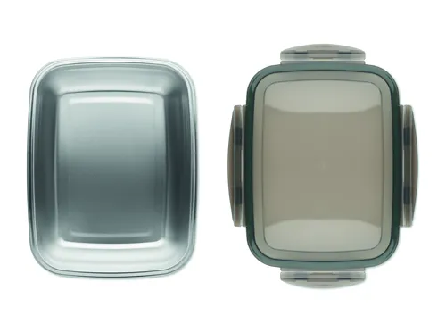 Újrahasznosított, rozsdamentes acél uzsonnásdoboz, PP fedéllel és 4 oldalas kattintós záródással, elválasztóval. Űrtartalom: 1500 ml.