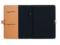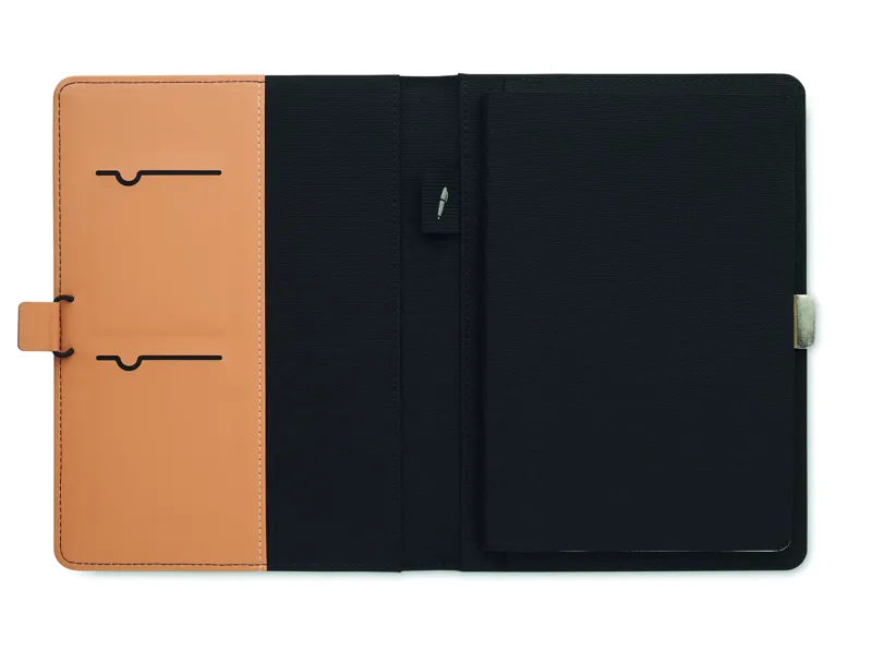 A5 iratmappa RPET anyagból, műbőr részletekkel. Cserélhető A5 jegyzetfüzet keménytáblás parafa borítóval. Cérnafűzött. 128 vonalas oldal (64 lap) újrahasznosított papírból. Tolltartó. 2 kártyatartó és egy nagy rekesz. Elasztikus zárópánt fém részlettel. FSC®-certified | FSC MIX, P8.6, FSC-C213206
