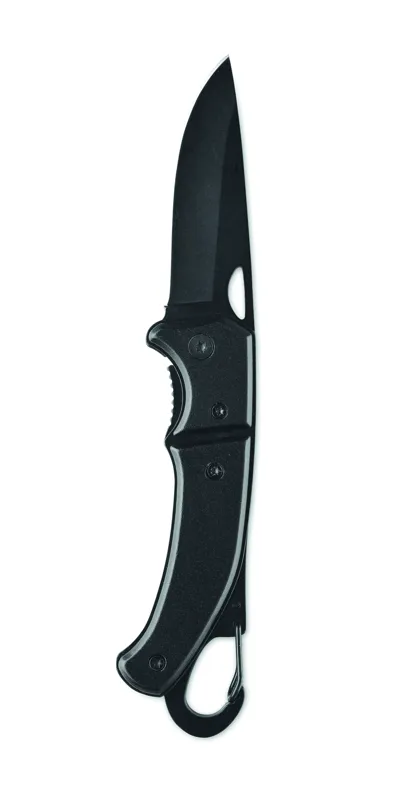Összecsukható alumínium kés karabinerrel. Rozsdamentes acél pengével. A karabiner hegymászásra, védőfelszerelés céljára nem alkalmas.