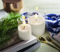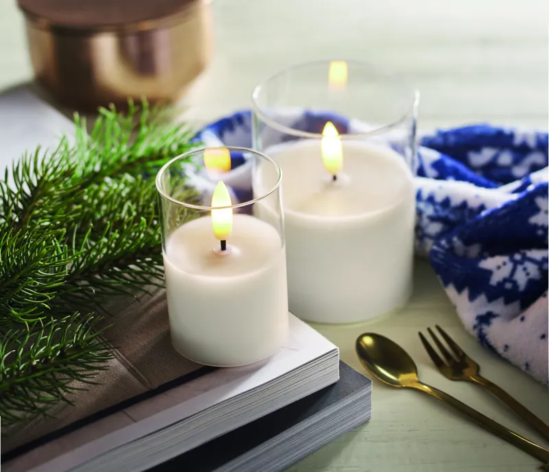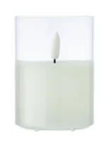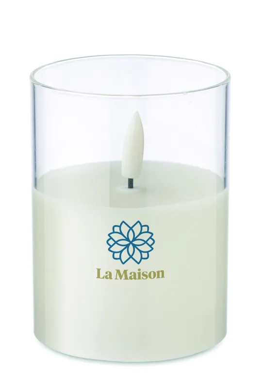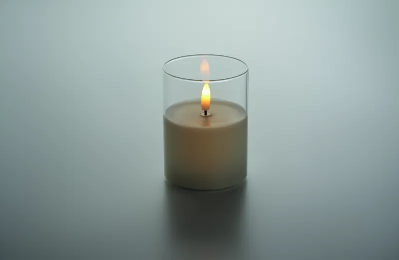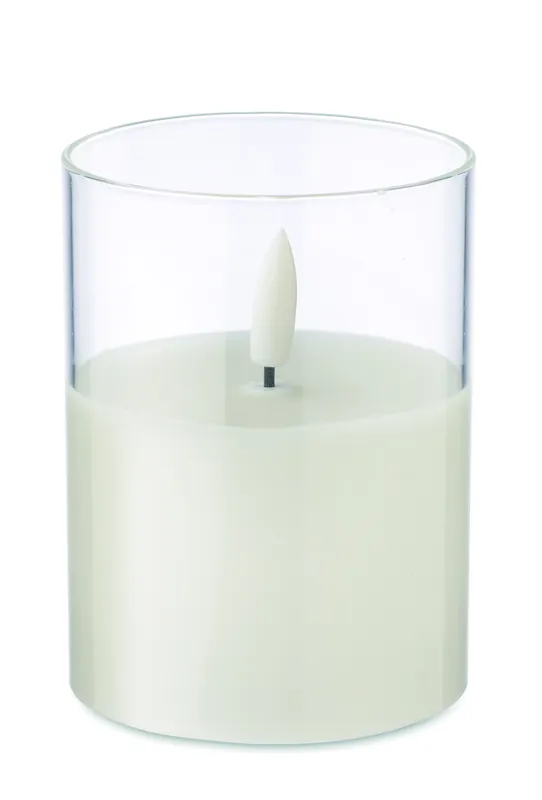 LED-es viaszgyertya üvegtartóban, valós lánghatással. 2 db AA elemmel működik, elem nélkül szállítjuk.